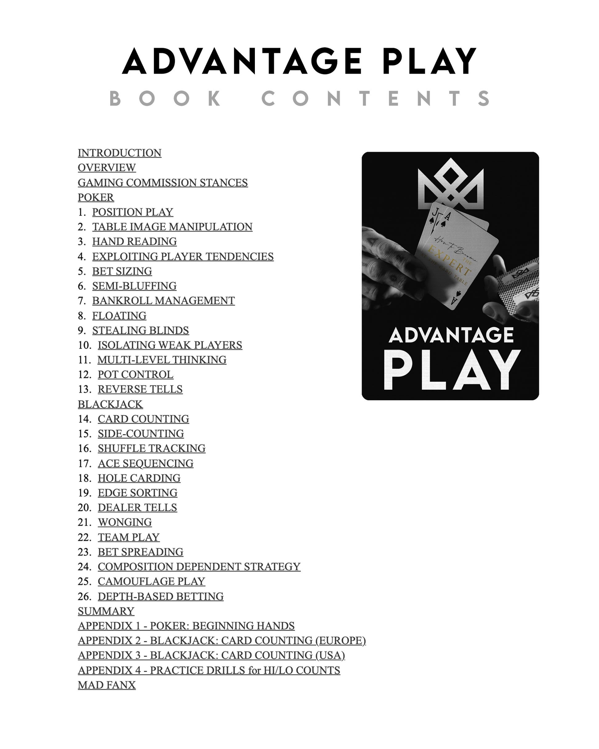 In this pocket guide, Madison outlines a number of ways you can use advantage play to win at poker and blackjack without breaking any rules. Packed with clear explanations on everything from card counting to shuffle tracking, this little book is the perfect introduction to advantage play.