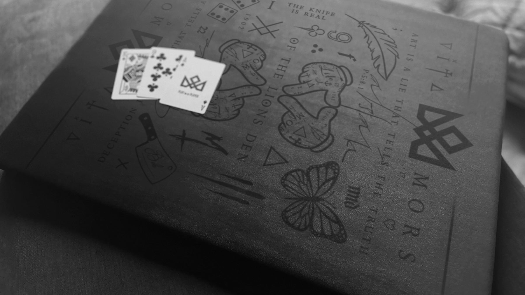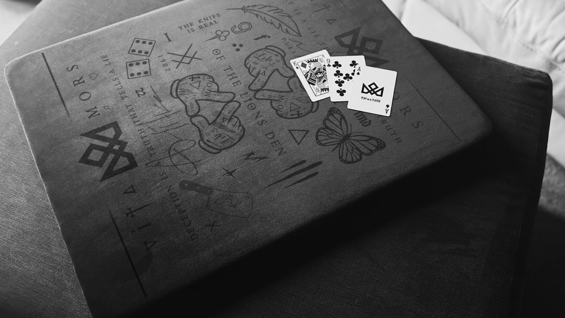 Playing surface: This features a debossed back design of the TRIBUTE Playing Cards - on black velvet.