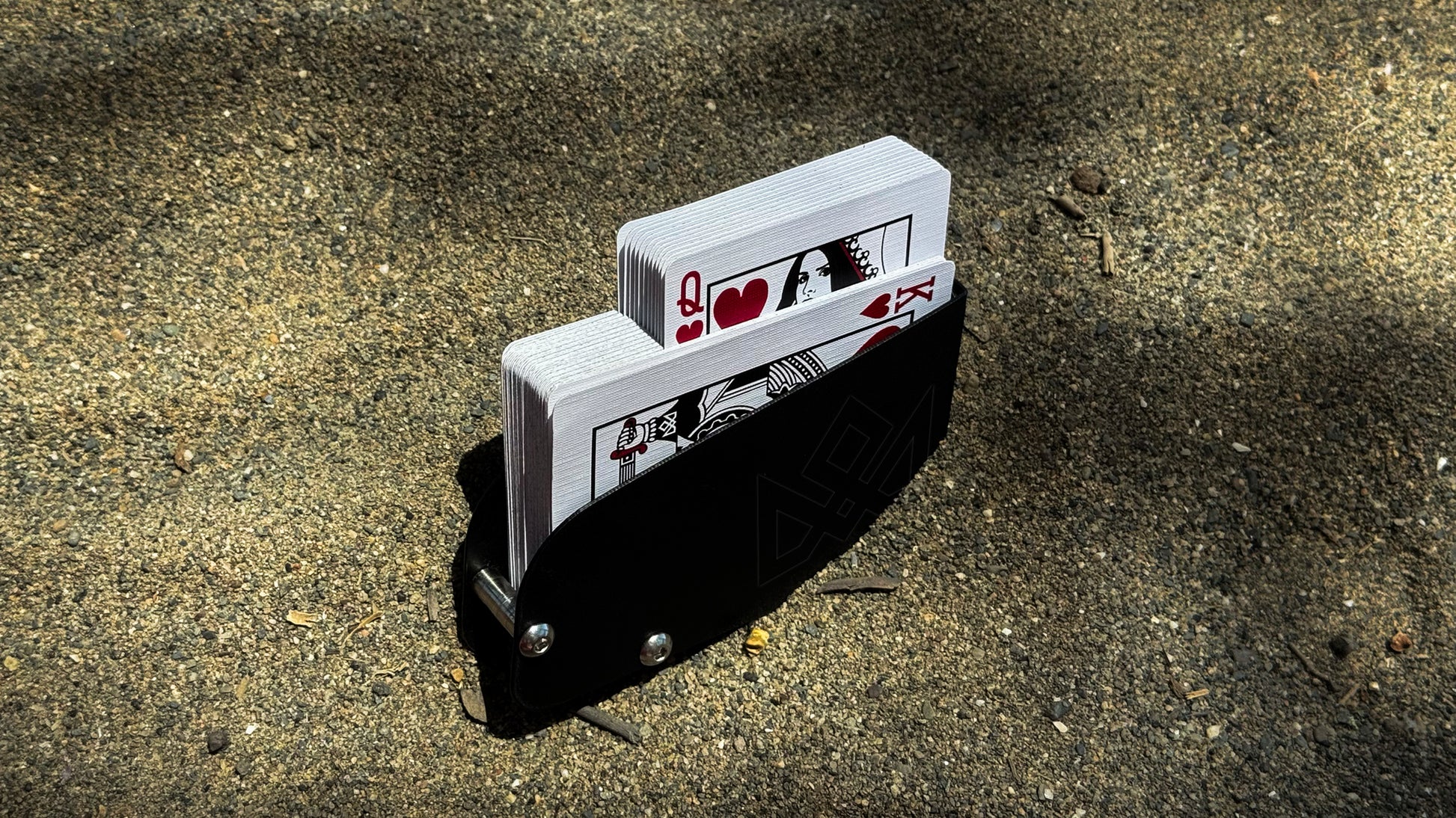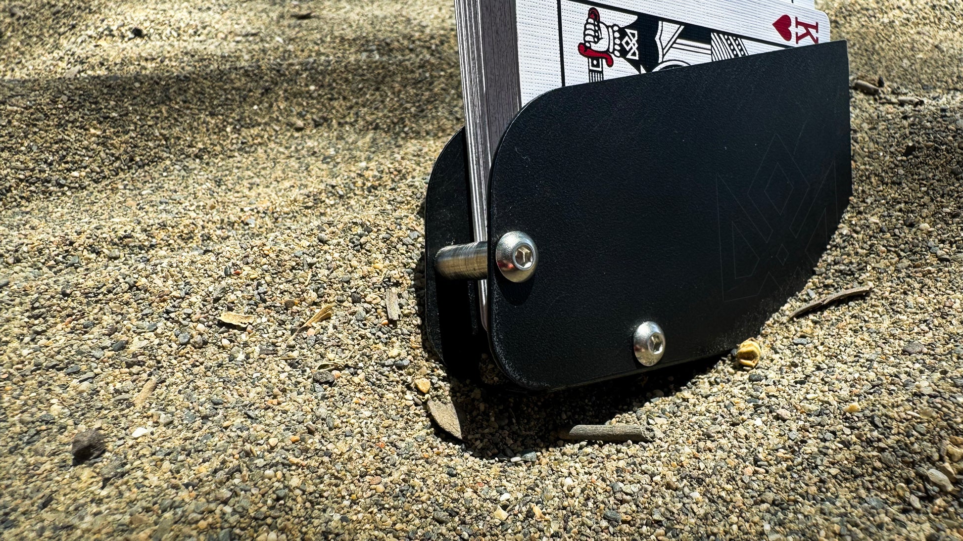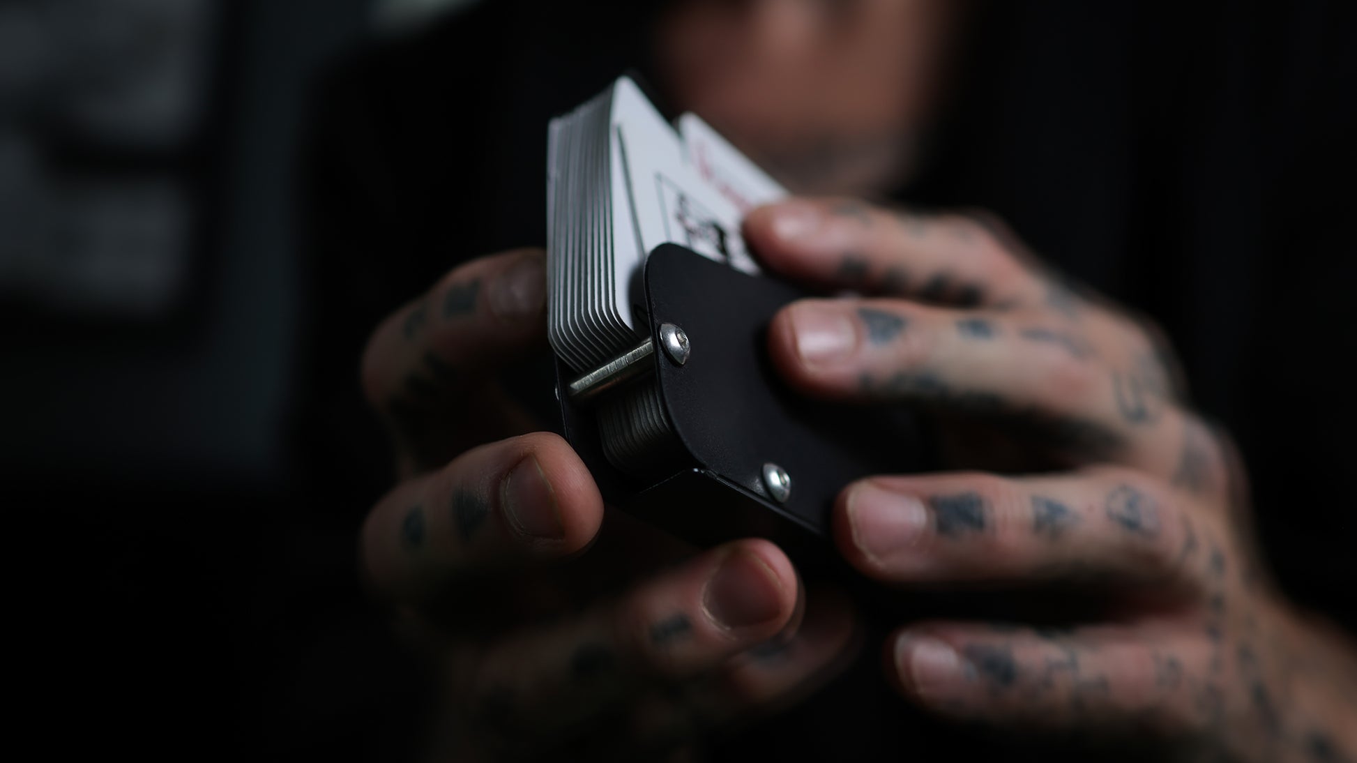 The new device by MADISON and O’HARE comes with a few revolutionary improvements that once again prove the genius of Eoin O’hare’s mechanical and precision engineering. This device acts as a holster for the deck, replacing the original torn tuck box. The deck is secured inside the black flexible device, by the design and the new features, which on first inspection appear to be simple steel bars that also hold the device together, however, these two simple bars allow for the smoothest of extrications by becoming pivot-points for the desired cards…