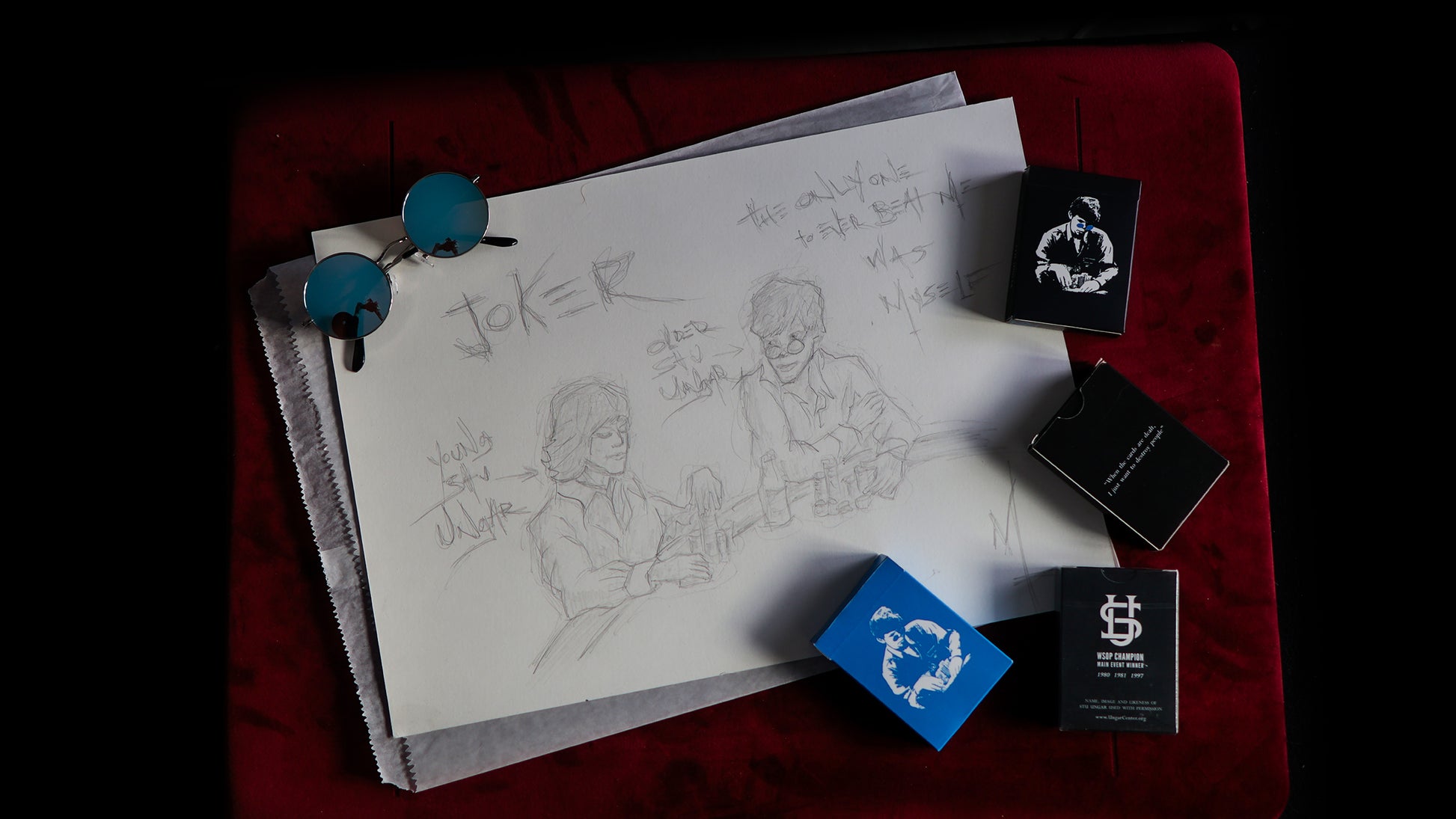 This Madison One Entry includes the two original prototypes, my first Ungar deck and a new sealed deck. This also includes my Ungar Shiner Shades and the original concept art for the Joker, the idea of younger Stu playing his older self inspired by his quote...
